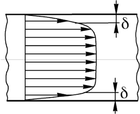 По Прандтлю, поток в трубах при турбулентном течении условно разбивается на две области (двухслойная модель Прандтля): турбулентное ядро, в котором определяющими являются напряжения Рейнольдса, и тонкий вязкий подслой (ламинарный подслой по Прандтлю либо пристенный слой) вблизи стенки, в котором влияние турбулентности пренебрежимо мало, а касательные напряжения обусловлены физической вязкостью в соответствии с законом трения Ньютона.
