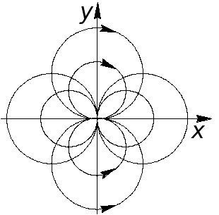. Таким образом, линии тока нового течения представляют собой окружности, проходящие через источник и сток.