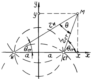 Пример 6.4. Выполним сложение источника и стока с одинаковыми расходами, симметрично расположенными относительно начала координат на расстоянии a (см. рис. 6.10). Потенциалы скорости: источника