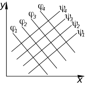 Отрезки AB и AD в каком-то масштабе представляют скорости течения, их результирующая определяется как диагональ параллелограмма (AC). Для построения такой сетки необходимо соблюсти следующее условие: расход между соседними линиями тока обоих течений должен быть одинаков.