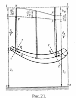 Уравнение (73) и есть уравнение Д. Бернулли для элементарной струйки реальной жидкости при установившемся движении, которое устанавливает связь между скоростью движения, давлением в жидкости и положением точки в пространстве. Оно справедливо для любых двух сечений, так как сечения 1-1 и 2-2 были взяты произвольно. Уравнение (73) можно изобразить и графически (рис. 21). Если соединить уровни жидкости в пьезометрах, присоединенных к нескольким сечениям, получим некоторую линию р-р, которая называется пьезометрической линией и показывает изменение удельной потенциальной энергией по длине элементарной струйки. Если соединить точки, которые в каждом сечении вертикали изображают полную удельную энергию (а такие точки действительно можно получить, о чем см. ниже), получим некоторую линию N-N, которая называется напорной линией или линией энергии; она показывает изменение полной удельной энергии по длине струйки. Тогда расстояние по вертикали в любом сечении между горизонтальной плоскостью I-I, соответствующей начальному запасу удельной энергии в первом сечении, и напорной линией N-N дает величину потерь энергии hw на преодоление сил сопротивления на участке от первого сечения до данного сечения, а расстояние между напорной и пьезометрической линиями – удельную кинетическую энергию в данном сечении u2/2g.