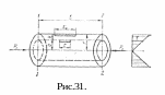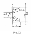 незапное расширение потока (рис. 32). Этот случай поддается теоретическому обоснованию. Из опытов установлено, что поток жидкости, вытекающий из узкой трубы, не сразу заполняет все сечение широкой трубы; он отрывается от стенок и дальше двигается в виде расширяющейся струи. В кольцевом пространстве между струей и стенками трубы жидкость образует завихрения. На некотором расстоянии l от расширения трубопровода струя вновь заполняет все сечение. В результате вихревых движений жидкости между сечениями 1-1 и 2-2 идет постоянный обмен между струей и жидкостью в кольцевом пространстве. В результате этих явлений происходит переход механической энергии в тепловую, что и является причиной потерь напора.