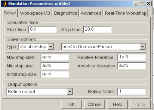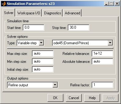 Параметры моделирования задаются в диалоговом окне, вызываемом из меню Simulation->Simulation Parameters.
