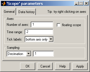 Параметры блока устанавливаются в окне ‘Scope’ parameters, которое открывается с помощью инструмента