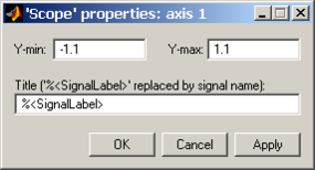 Если щелкнуть правой клавишей “мыши” в окне графиков и, выбрать команду Axes properties… в контекстном меню, откроется окно свойств графика, в котором с помощью параметров Y-min и Y-max можно указать предельные значения вертикальной оси. В этом же окне можно указать заголовок графика (Title), заменив выражение %<SignalLabel> в строке ввода.