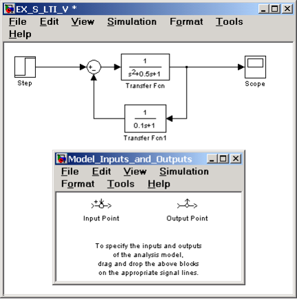В результате выполнения команды откроется окно Model_Inputs_and_Outputs как это показано на рисунке, а также пустое окно Simulink LTI-Viewer .