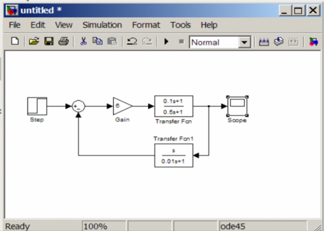 Наберем систему, состоящую из сумматора, коэффициента усиления и двух блоков передаточных функций показанную в рабочем окне на рисунке вверху.