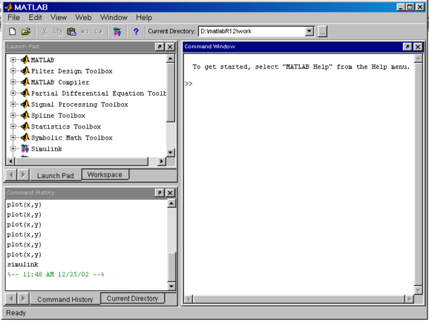 Работа системы идет в среде «Mathlab». Выполнить вход в нее можно, используя ярлык, созданный в меню «Пуск» и/или на рабочем столе при установке системы. Окно, появляющееся при запуске системы называется рабочей областью. В рабочей области есть командная строка(command window) для ведения диалога с системой.