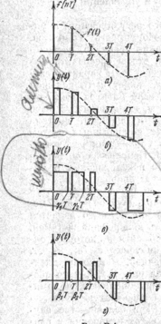 Широтно-импульсная модуляция (амплитуда импульсов постоянна, а их ширина γnT пропорциональна в некоторых пределах значениям f[nT])(рис. в))