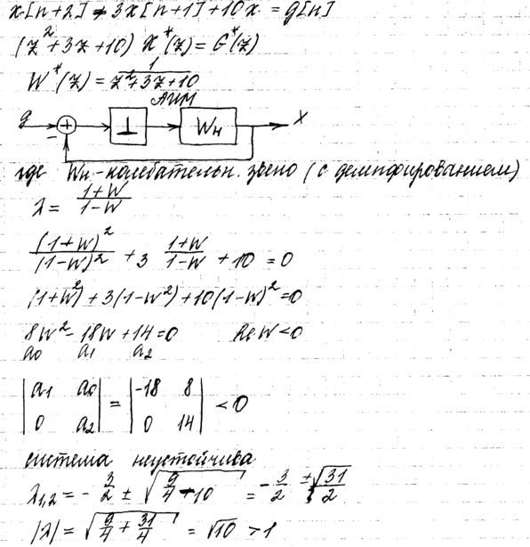 b0·x[n+k]+ b1·x[n+k-1]+…+ bk-1·x[n+1]+ bk·x[n]= g[n]. Если при любых начальных условиях | x[n] | < M , то система устойчива. Если x[n] стремится к 0 то система устойчива асимптотически. Если стремится к бесконечности – неустойчива.