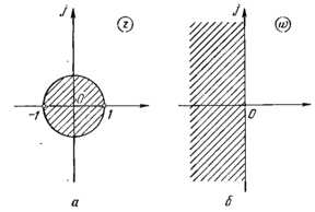 ледовательно, геометрически область устойчивости системы на плоскости корней z изобразится единичным кругом. Если применить W-преобразование то этот круг отобразится в левую полуплоскость w.