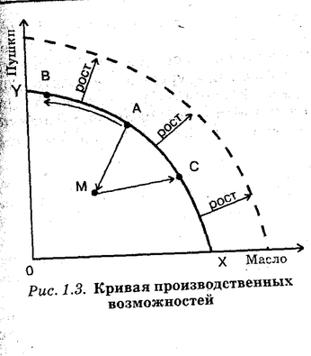 роиллюстрируем способ решения этого вопроса с помощью кривой производственных возможностей (рис. 1.3), которая выражает максимальный потенциально возможный объем производства при полном использовании ресурсов на данном технологическом уровне.