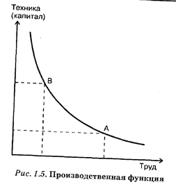 роизводственная функция показывает альтернативные способы получения одного и того же количества продукта с помощью использования разных комбинаций ресурсов (факторов производства). Так, ручной труд может быть заменен механизированным. При этом за высвобождение части рабочей силы экономика должна заплатить увеличением числа машин и соответственно затраченным на них капиталом. На рис. 1.5 видно, что при перемещении по изокванте из точки А в точку В падает потребность в одном и растет необходимость в другом ресурсе. Иначе го-воря, это тоже проблема выбора, но в данном случае — между разными ресурсами.