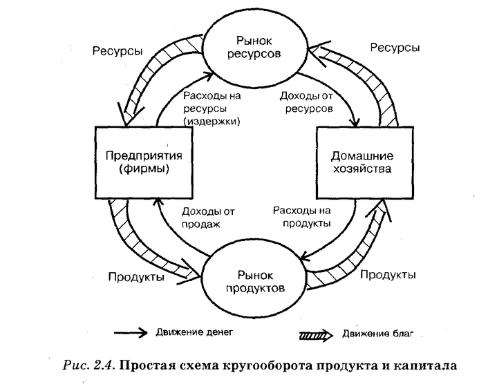 ущность данного подхода наилучшим образом прослеживается на простейшей модели, которая используется в микро экономике. На рис. 2.4 хорошо видно, что расходы одного субъекта являются доходами другого. Расходы домашних хозяйств, произведенные на рынке продуктов, становятся для фирм доходами. Расходы фирм на покупку ресурсов являются доходами для владельцев домашних хозяйств. Таким образом строится один кругооборот — до нежный, который можно назвать «доходы — расходы».Но имеется и встречный материально-вещественный круп» оборот «ресурсы — продукция». Потребительские товары производятся предприятиями, но потребляются домохозяйствами. Они являются основой физического существования людей, составляющих домохозяйства. Однако возможность произвести эти товары возникает лишь потому, что домохозяйства предоставляют фирмам находящиеся в их собственности ресурсы. Очевидно, что схема