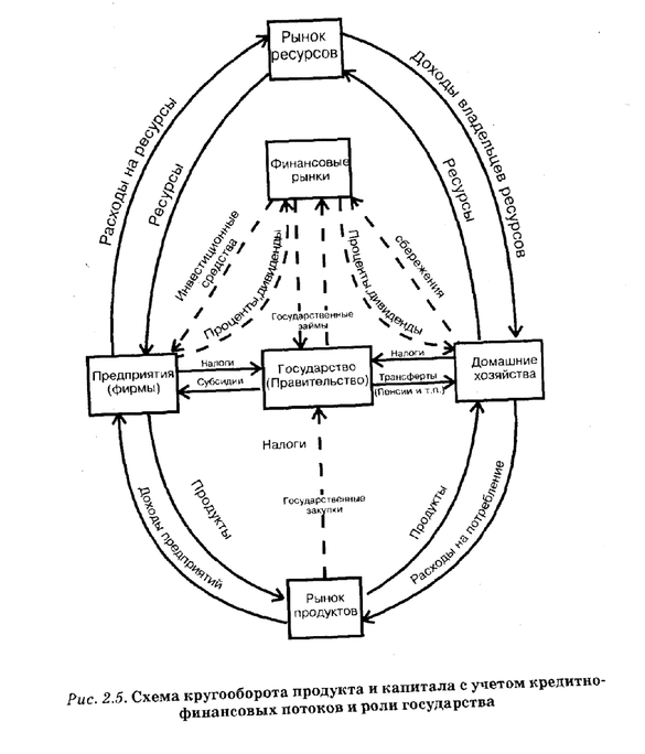 еперь, освоив принцип построения модели, рассмотрим взаимосвязи основных субъектов экономики с учетом финансовых рынков. При этом отразим не только движение продукта и денег, но и капитала (рис. 2.5)В дополнение к уже указанным отношениям между предприятиями и домашними хозяйствами проанализируем взаимосвязи, которые появляются при наличии новых субъектов и рынков.
