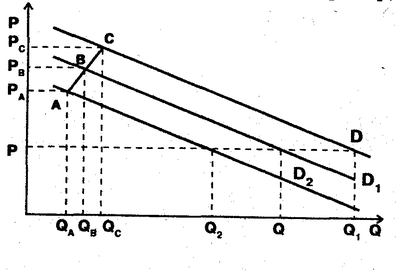 иие, что нарушен закон спроса: ведь несмотря на рост цен (от Ра до Рс) физический объем спроса растет (от Qа до Qc). В действительности негативное влияние роста цен здесь просто маскируется ростом доходов. Рост цен сократил бы размеры спроса, но из-за роста дохода кривая спроса последовательно перемещалась из положения D2 в положение D, а затем и D1 что вызвало увеличение спроса. Легко видеть, что не будь этого смещения и продолжай действовать кривая спроса D2, даже подъем цен от Ра до Рв неминуемо вызвал бы резкое снижение спроса.