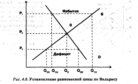 Объяснение установления равновесия за счет колебания цен, в ходе которого их повышение или понижение приводит рынок в состояние равновесия, принадлежит швейцарскому экономисту Л. Вальрасу (1834—1910).