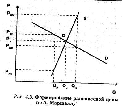 ной подход к объяснению механизма установления рыночного равновесия использовал великий английский экономист А. Маршалл (1842-1924), который считал, что реагируя на нарушение рыночного равновесия, продавцы маневрируют не ценами, а объемом предложения (рис. 4.9). Логика его рассуждений такова. При любом объеме производства ниже равновесного (например, при QA) цена предложения меньше цены спроса (Рas < Рad). Это весьма выгодно для продавцов: выставив свои товары на продажу по цене