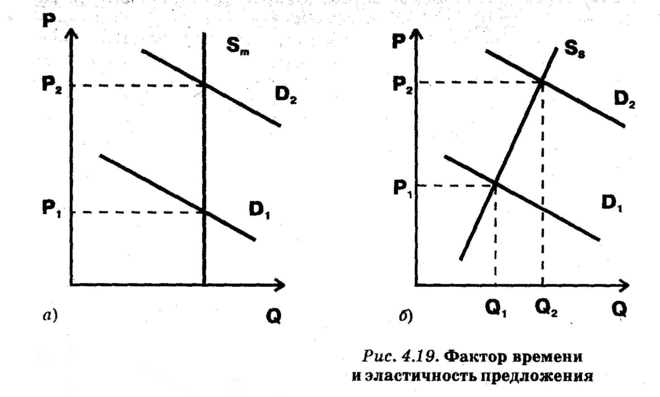 В коротком и длительном периодах (рис. 4.19 б, в) с ростом спроса объем предложения будет нарастать, т.е. предложение приобретет известную эластичность. При этом цена будет также расти, но в