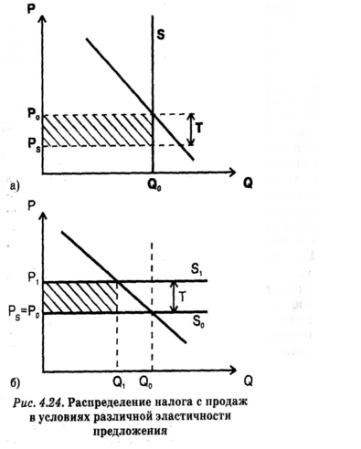 В случае абсолютно неэластичного спроса (рис. 4.23 б), т.е. в ситуации, когда у потребителя нет возможности ни перейти от подорожавшего вследствие введения налогов товара к более дешевому, ни отказаться от него вовсе, равновесная цена поднимется сильно, а объем реализуемой продукции не сократится. Рост налоговых поступлений в этих условиях будет велик (заштрихованный прямоугольник). Ведь Q0 не сократилось и налог уплачивается со всей этой товарной массы.