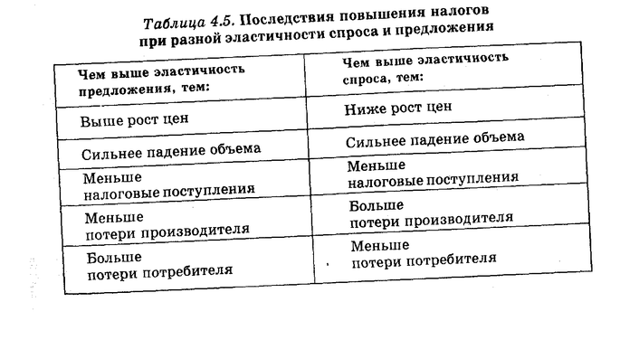 целом результаты введения новых налогов при разной степени эластичности спроса и предложения сведены вместе в табл. 4.5.