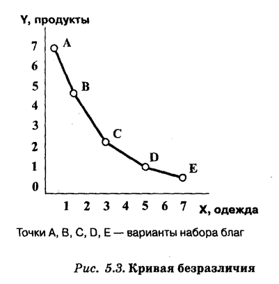 Меньшее количество одного блага вполне компенсируется большим количеством другого, в результате потребительский эффект каждого варианта практически одинаков. Так, потребителю все равно, получить ли ему 7 единиц продуктов и 0,5 единицы одежды (вариант А) или 7 единиц одежды и 0,5 единицы продуктов (вариант Е). Следовательно, все пять вариантов — это наборы безразличия, которые удовлетворительны для покупателя в равной