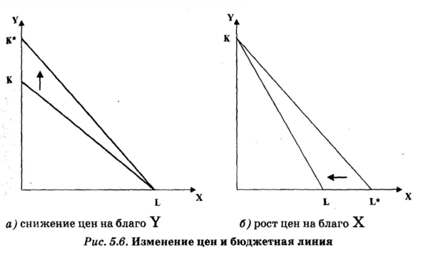 Снижение цен блага Y сместит линию вверх вдоль оси Y (рис. 5.6 а); рост этих же цен вызовет смещение бюджетной ли-