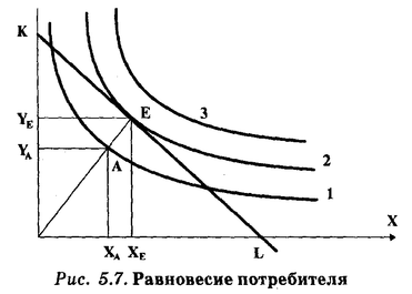 бъединим теперь анализ кривых безразличия и бюджетных линий. На рис. 5.7. изображены бюджетная линия потребителя и карта кривых безразличия.Каждая кривая безразличия (на графике это кривые 1, 2 и 3)