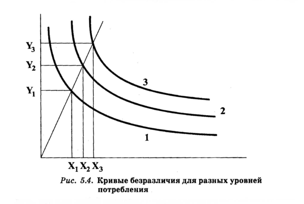 а рис. 5.4 изображены три кривых безразличия для повышающихся (от кривой 1 до кривой 3) уровней потребления. Легко ви-