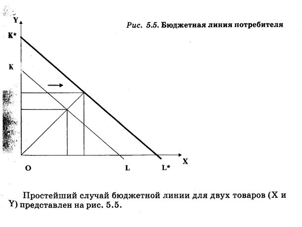 Легко видеть, что бюджетная линия KL является прямой. В самом деле, если выразить из уравнения (5.3) объем закупки любого из двух товаров при неизменном размере бюджета потребителя, соответствующая формула будет иметь вид линейного уравнения.