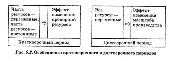 Фактор физического (или астрономического) времени имеет лишь косвенное отношение к выделению краткосрочного и долгосрочного периодов. Их продолжительность у каждой отрасли и страны своя. Это обусловлено особенностями производства — его капиталоемкостью, длительностью технологического цикла, технологией и экономикой строительства. Например, краткосрочный период в торговле может измеряться немногими неделями или даже днями (время сооружения нового торгового павильона), а в энергетике тянется от 6 до 10 лет (примерно столько длится сооружение ГЭС). Истинным критерием разделения краткосрочного и долгосрочного периодов является не время, а наличие (в краткосрочном) или отсутствие (в долгосрочном) деления всех ресурсов на постоянные и переменные (рис. 6.2).