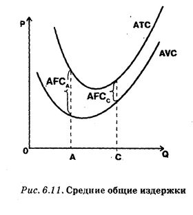 ствительно, AFC падают с ростом объема производства, расстояние между АТС и AVC становится все меньше (рис.6.11), Заметим, что минимальное значение АТС приходится на точку с большим объемом производства, нежели для минимального значения AVC. Это обусловлено следующими обстоятельствами: вначале рост AVC компенсируется падением AFC, в результате АТС продолжают убывать. Однако при дальнейшем росте производства увеличение AVC уже перекрывает снижение AFC, поэтому АТС начинает возрастать.