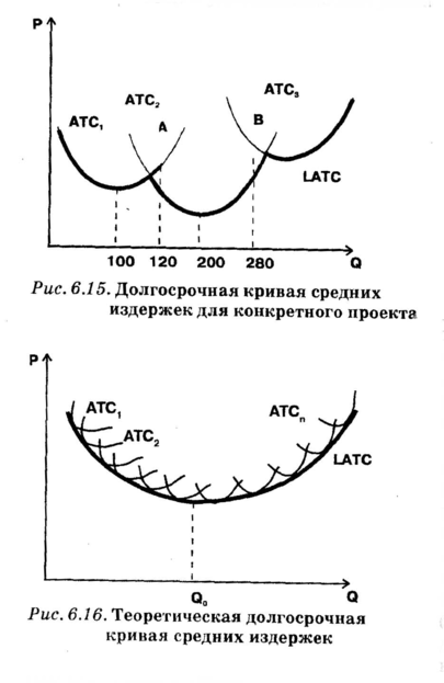 в данном периоде удобно анализировать с по мощью функции долгосрочных средних издержек LATC. Что представляет собой эта функция? Предположим, что правительство Москвы решает вопрос о расширении принадлежащего городу завода АЗЛК. При имеющейся производственной мощности минимизация издержек достигается при объеме производства в 100 тысяч автомобилей в год. Это положение вещей отображает кривая краткосрочных средних издержек ATC1, соответствующая данному масштабу производства (рис. 6.15).Пусть введение новых моделей, выпуск которых намечен совместно с «Рено», увеличило спрос на автомобили. Местный проектный институт предложил два проекта расширения завода, соответствующих двум возможным масштабам производства. Кривые АТС2 и АТС3 являются кривыми краткосрочных средних издержек для этих больших масштабов производства. При при-