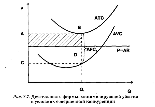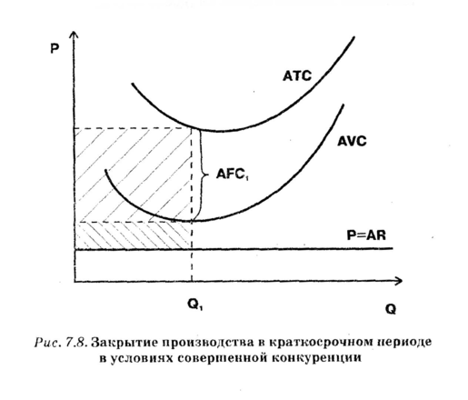 При любом положительном объеме выпуска потери (убытки) больше совокупных постоянных издержек. Это отчетливо видно на графике (рис. 7.8). Величина убытков при объеме производства Q1 равна площади всего заштрихованного прямоугольника ([АТС1]) - Р] х Q1 ). Постоянные же издержки могут быть рассчитаны как средние постоянные издержки в расчете на единицу продукции (AFC1 =АТС1 - AVC1), умноженные на Q1 На графике они выделе ны как часть заштрихованного прямоугольника с менее плотной штриховкой. Вся же часть прямоугольника, покрытая плотной штриховкой, — это чистые убытки из-за не прекращения производства. Остановив завод, их можно было бы избежать.