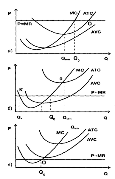 единицу продукции. На графике хорошо видно, что именно здесь расстояние между кривыми АТС и Р наибольшее. Однако фирма максимизирует не удельную прибыль на единицу продукции, валовый объем прибыли от всего производства. Поэтому ей нет смысла отказываться от выпуска единиц продукции, лежащих между Qmin и Q0. Пусть в расчете на единицу продукции прибыли для них несколько ниже, но вклад в увеличение валовой прибыли внесут и они. Ведь здесь действует неравенство MR > МС, а значит, фирма выигрывает от выпуска каждой единицы дополнительной продукции.