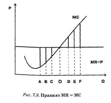 условиях совершенной конкуренции предельный доход равен цене товара. Поэтому правило MR = МС может быть представлено и в иной форме: Р = MR = МС, или Р = МС.То есть в условиях совершенной конкуренции максимизация прибыли (минимизация убытков) достигается при объеме производства, соответствующем точке равенства предельных издержек и цены.
