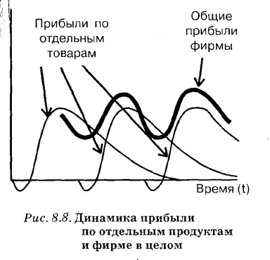 В теории маркетинга эти соображения детально анализируются с помощью концепции цикла жизни продукта. Согласно ей каждый продукт с момента своего изобретения переживает ряд стадий, причем этап высоких прибылей рано или поздно сменяется периодом их падения или даже убытков. Поэтому всякая эффективно работающая фирма должна своевременно разрабатывать новые продукты (или новые модификации старых продуктов), чтобы поток прибылей оставался непрерывным.