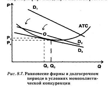 ассмотрим более внимательно состояние устойчивого долгосрочного равновесия при монополистической конкуренции (точка О на рис. 8.7). Для начала зафиксируем уже установленный факт. Точка О лежит на кривой АТС, т.е. доход строго равен издержкам. Таким образом, в длительном периоде монополистическая конкуренция, подобно совершенной конкуренции, обнаруживает тенденцию к получению фирмами нулевой экономической прибыли. Эта черта обоих типов рынка является следствием легкости вхождения на рынок и выхода из него.Другая важная особенность положения точки долгосрочного равновесия заключается в том, что, находясь на кривой АТС, она, однако, не совпадает с точкой минимума средних затрат. И в этом состоит важное отличие равновесия в долгосрочном периоде при монополистической конкуренции от равновесия при совершенной конкуренции. Почему же названные две точки не могут совпасть? Дело в том, что кривая спроса может быть касательной к кривой затрат в точке их минимума только в том случае, если кривая спроса горизонтальна.