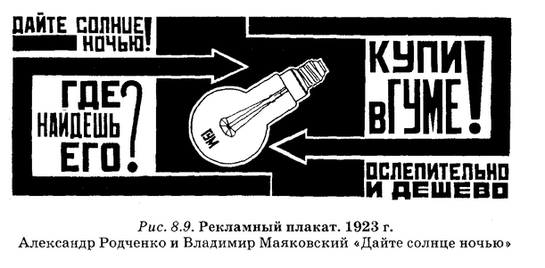 нашей стране до революции реклама лишь начинала приобретать подлинный размах. Краткий период ее расцвета в советское время приходился на годы нэпа, когда она использовалась не только частными, но и государственными, действовавшими на коммерческой основе трестами и синдикатами. Лидеры советского художественного авангарда А. Лентулов, Л. Попова и особенно тандем А. Родченко — В. Маяковский создавали в те годы мировые шедевры рекламы.Однако с упразднением нэпа они скоро забылись, а реклама выродилась в простой элемент оформления домов и улиц. Примером может служить многократно повторявшийся призыв летать самолетами Аэрофлота (других авиалиний все равно не было).