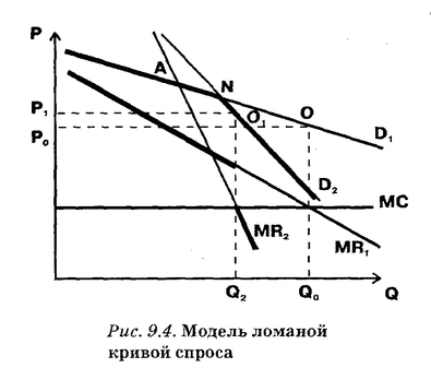 оответственно изменится и кривая предельного дохода (с МR1 на MR2). При этом если кривая спроса приобретает ломаную форму, то для кривой предельного дохода становится характерным разрыв (в ней появляется вертикальный участок).Точка О в этой ситуации перестанет быть оптимальной, т.е. обеспечивающей наивысшую прибыль. Ведь MR2 и МС пересекаются совсем в другой точке. Следовательно, для точки О более не выполняется правило МС = MR. Да она и не достижима вообще: в соответствии с новой кривой спроса продать по цене Р0 объем продукции Q0 просто невозможно. Ведь точка О лежит выше кривой спроса D2. Другими словами, первоначальная цель максимизации прибыли, ради которой, собственно, и начиналось снижение цен оказалась нереальной.