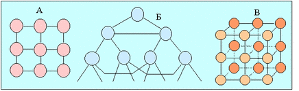 Современные вычислительные системы используют и другие топологии: решетки (А), кубы (В), гипердеревья (Б), гиперкубы и т.д. (см. рис. 4.3). Но так как некоторые вычислительные системы (кластеры) базируются на сетевых технологиях, я привожу и такие примеры. В некоторых системах топология может настраиваться на решаемую задачу.