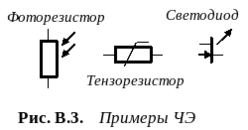 Первичным преобразователем или чувствительным элементом (ЧЭ) называется простейший элемент информационной системы, изменяющий свое состояние под действием внешнего возмущения (фотодиод, тензорезистор). Примеры обозначений ЧЭ, принятых на схемах информационных устройств, приведены на рис. В.3.
