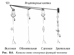 каждом из этих каналов возбуждение регистрируется системой ЧЭ (рецепторов), специфических для разных модальностей и передается по каналу связи (нервному волокну) в виде потенциалов действий. Система рецепторов каждой модальности связана с определенными отделами центральной нервной системы. На рис. В.6 показан вид каналов связи основных сенсорных модальностей.