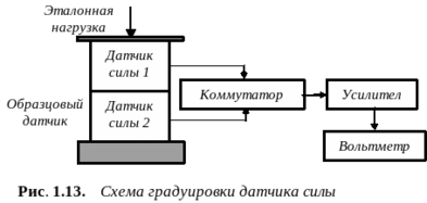 Для построения функции преобразования, а также определения ее отклонения от линейности проводится градуировка датчика. Методов градуировки несколько. Одним из наиболее распространенных является метод сравнительной или косвенной градуировки. В этом случае испытания проводятся с использованием образцового (эталонного) датчика с известной градуировочной характеристикой (рис. 1.13).