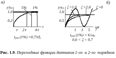 Время установления tуст можно определить по графику переходного процесса (рис. 1.9а). Так, время установления tуст (1%) = 4,6 t = 0,73/fг. Для tуст (10%) справедливо: tуст (10%) = tн = tс = 2,2t. Следовательно, чем выше граничная частота, тем выше быстродействие датчика.