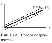 Погрешность проявляется в процессе измерения; она численно равна величине несоответствия измеренного значения некоторой величины и ее истинного значения (которое неизвестно, т.к. неизвестна реальная функция преобразования). Поскольку, реальная функция преобразования является случайной функцией измеряемой величины, все ее возможные реализации попадают в некоторую полосу относительно номинальной функции преобразования, называемую полосой погрешностей (рис. 1.12).