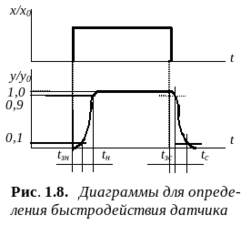 Различают четыре составляющих времени установления tуст (рис. 1.8): время задержки нарастания tзн, - время, соответствующее увеличению сигнала на выходе датчика на 10% от начального; время нарастания tн - время, необходимое для изменения выходного сигнала от 10% до 90%; время задержки спада tзс - время, соответствующее уменьшению сигнала на выходе датчика на 10% от установившегося значения (до 90%) и время спада tс - время, требуемое для уменьшения выходного сигнала от 90% до 10% установившегося значения.