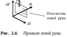 Основной силовой характеристикой магнитного поля является индукция B и сила Ампера F, связанные законом Ампера и правилом левой руки (рис.2.4):