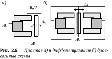 В трансформаторной схеме (рис. 2.8) используются три обмотки: первичная и две вторичные. Это позволяет электрически развязать первичную и вторичную цепи и существенно снизить влияние катушек на подвижный элемент датчика.