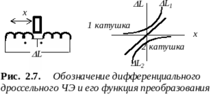 Существенное уменьшение погрешности нелинейности достигается дифференциальным (встречным) включением двух одинаковых катушек (рис. 2.6б). Имеем: